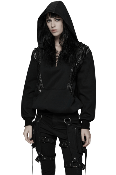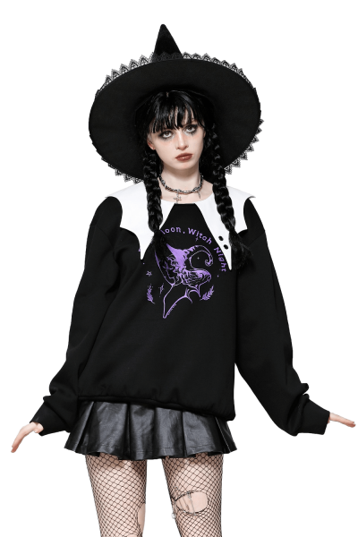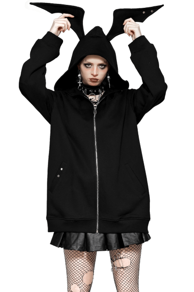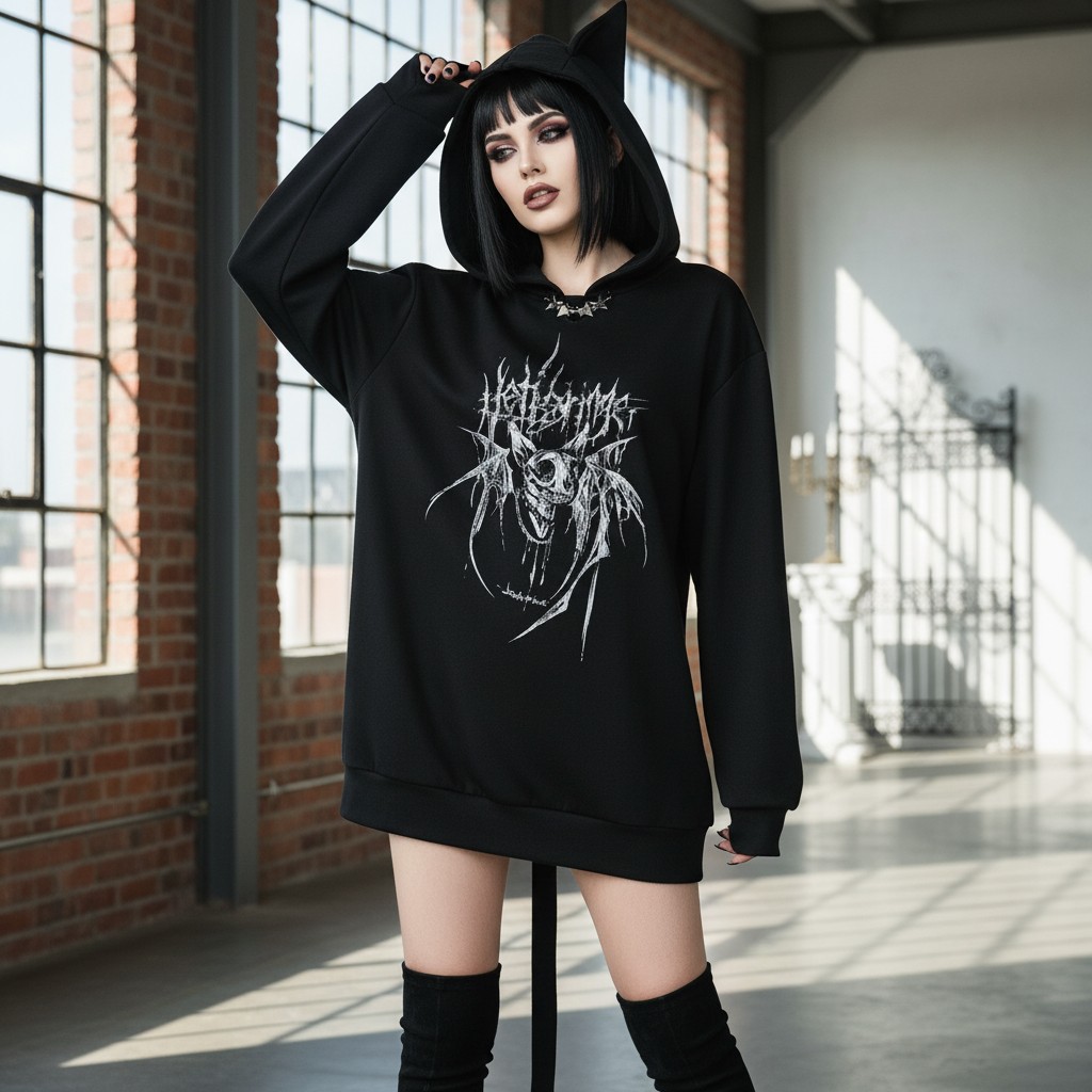 Cat ear hood revives dark fairy-tale vibe, metal demon print hides vintage Gothic soul, loose cut balances comfort and personality, interpreting medieval dark romance.