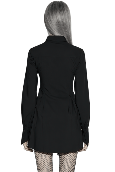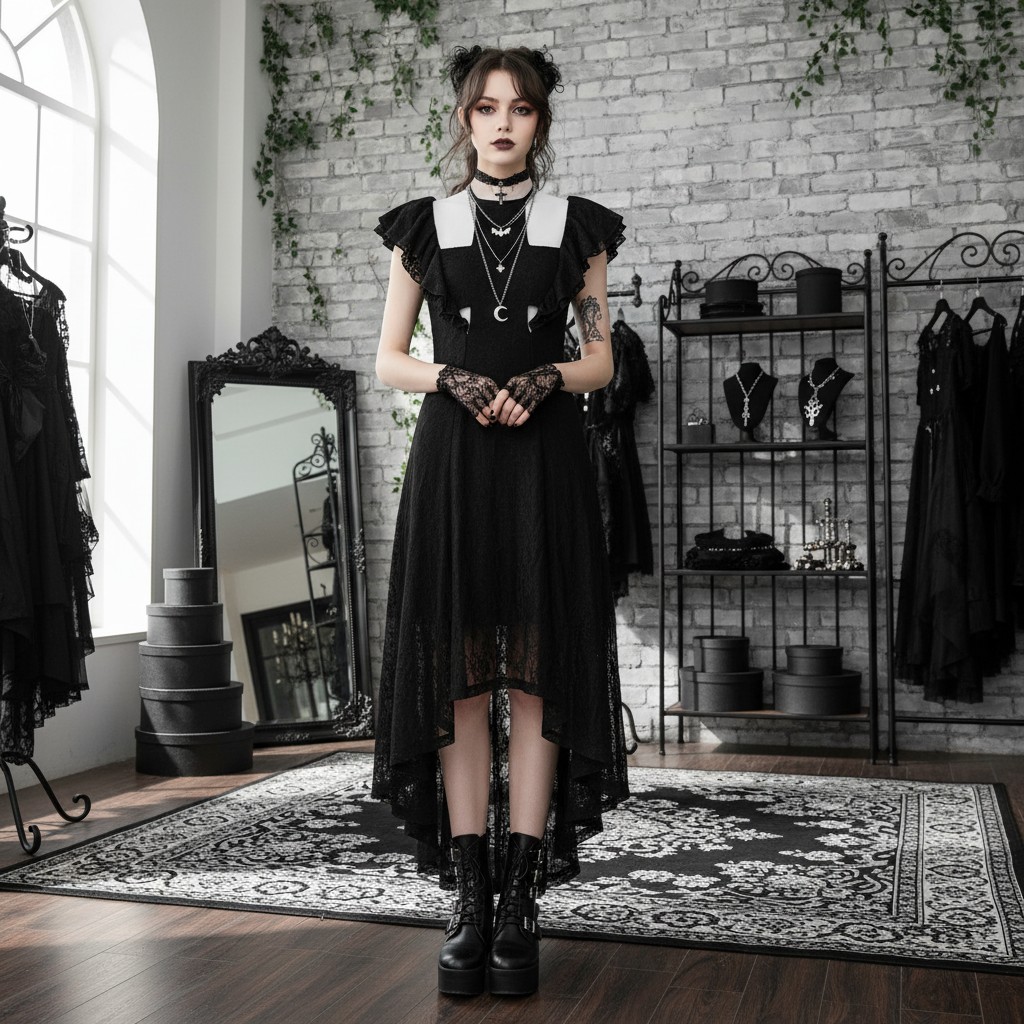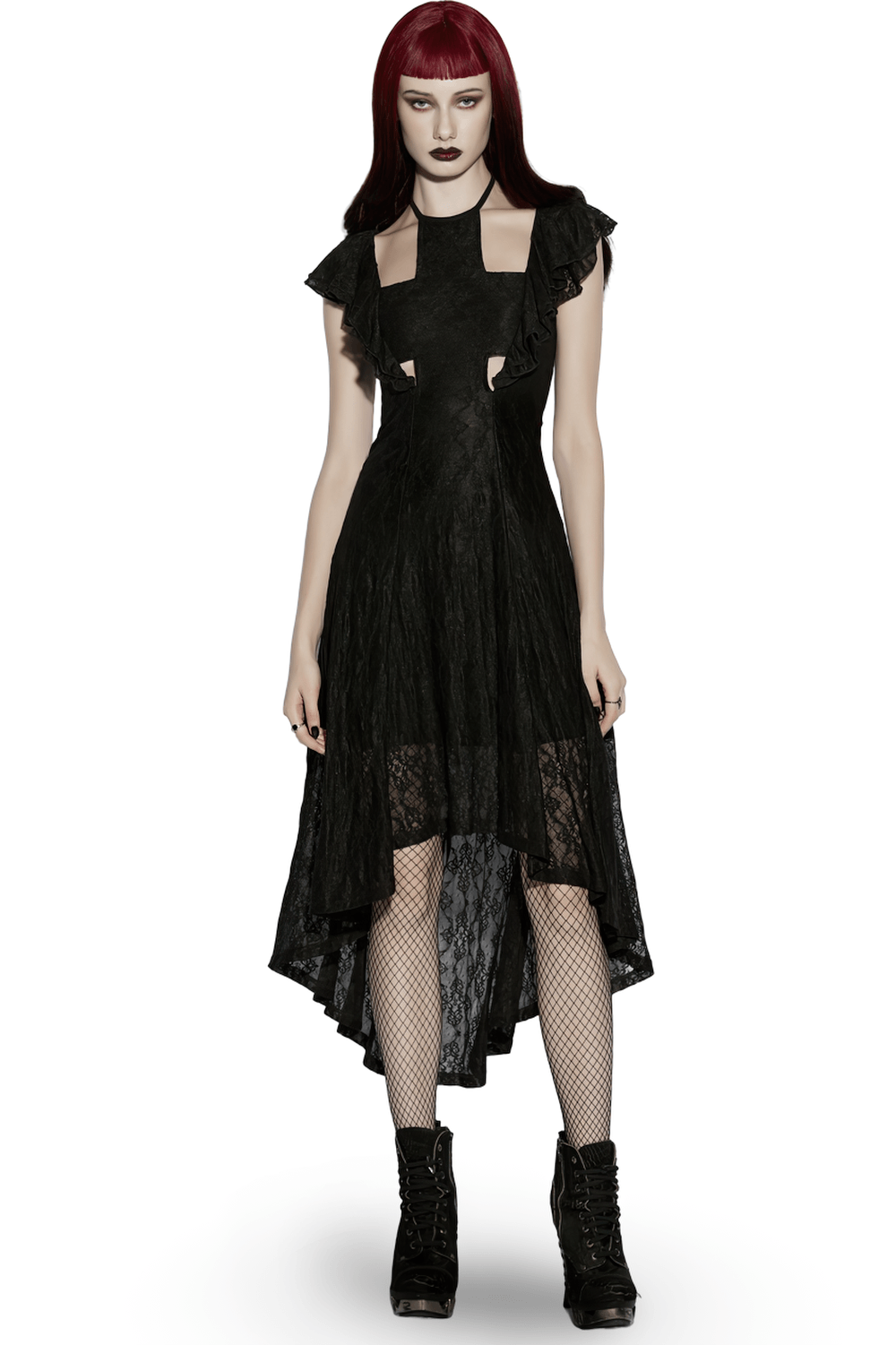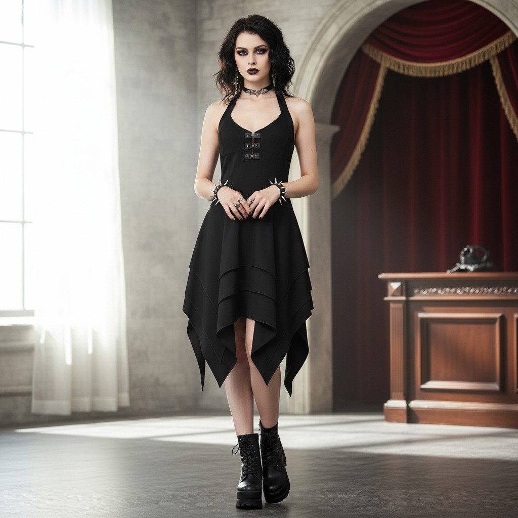 Halter deep V with metal buckles, tailored waist to define curves, and layered uneven hem that sways with movement—blending dark utility and Gothic elegance, perfect for parties and daily dark looks.